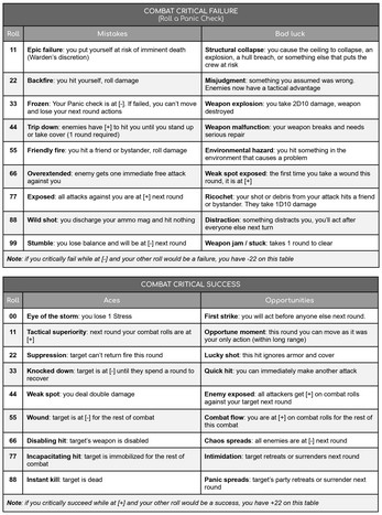 These tables for Mothership RPG can be used in combat to assess critical successes and failures. You can use them as a simple menu for possible outcomes, or cross-reference the number rolled and select one of the associated outcomes.
